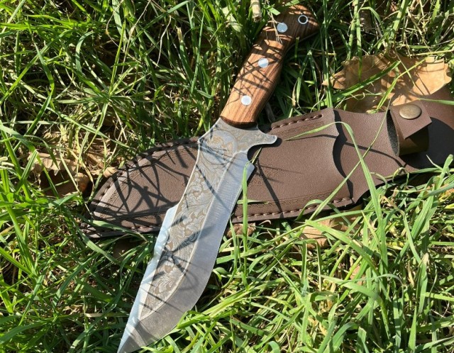 Çelik: 4116 paslanmaz çelikAğız: 18,5cm Sap: 13,5cmKalınlık: 4mmSap: Kökcevizden frezede işlenmiş Av köpeği figürüSertlik 58-59 HRC..