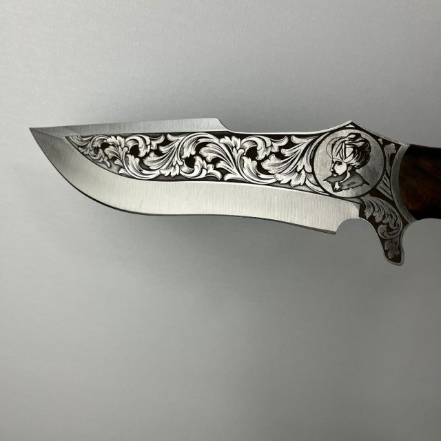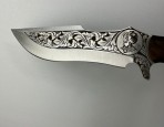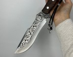 Çelik: 4116 paslanmaz çelikAğız: 18,5cm Sap: 13,5cmKalınlık: 4mmSap: Kökcevizden frezede işlenmiş Av köpeği figürüSertlik 58-59 HRC..